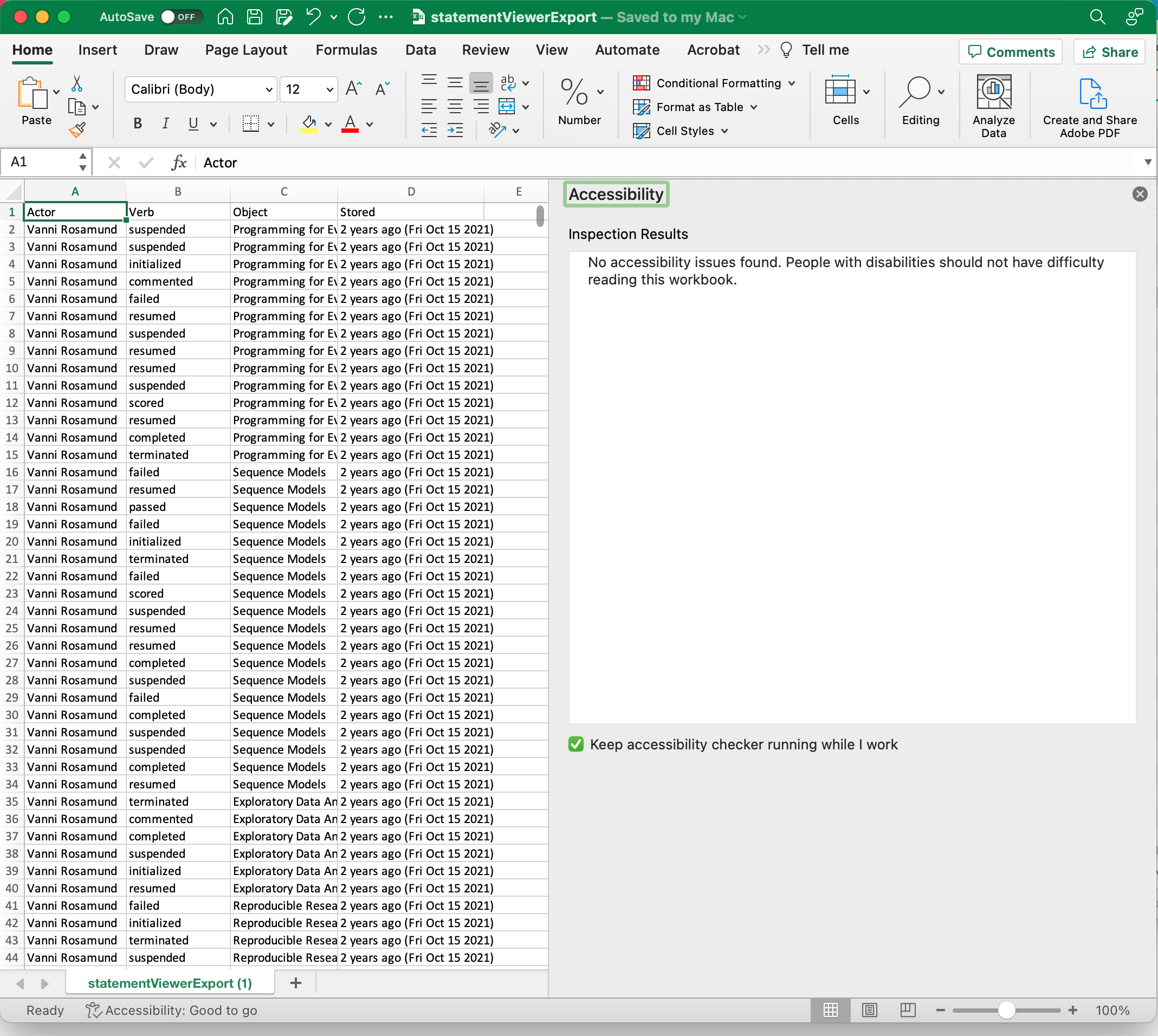 4. Open the CSV file in Microsoft Excel and save the file as a .xlsx file. Then enable the Accessibility checker. See screen capture below.
