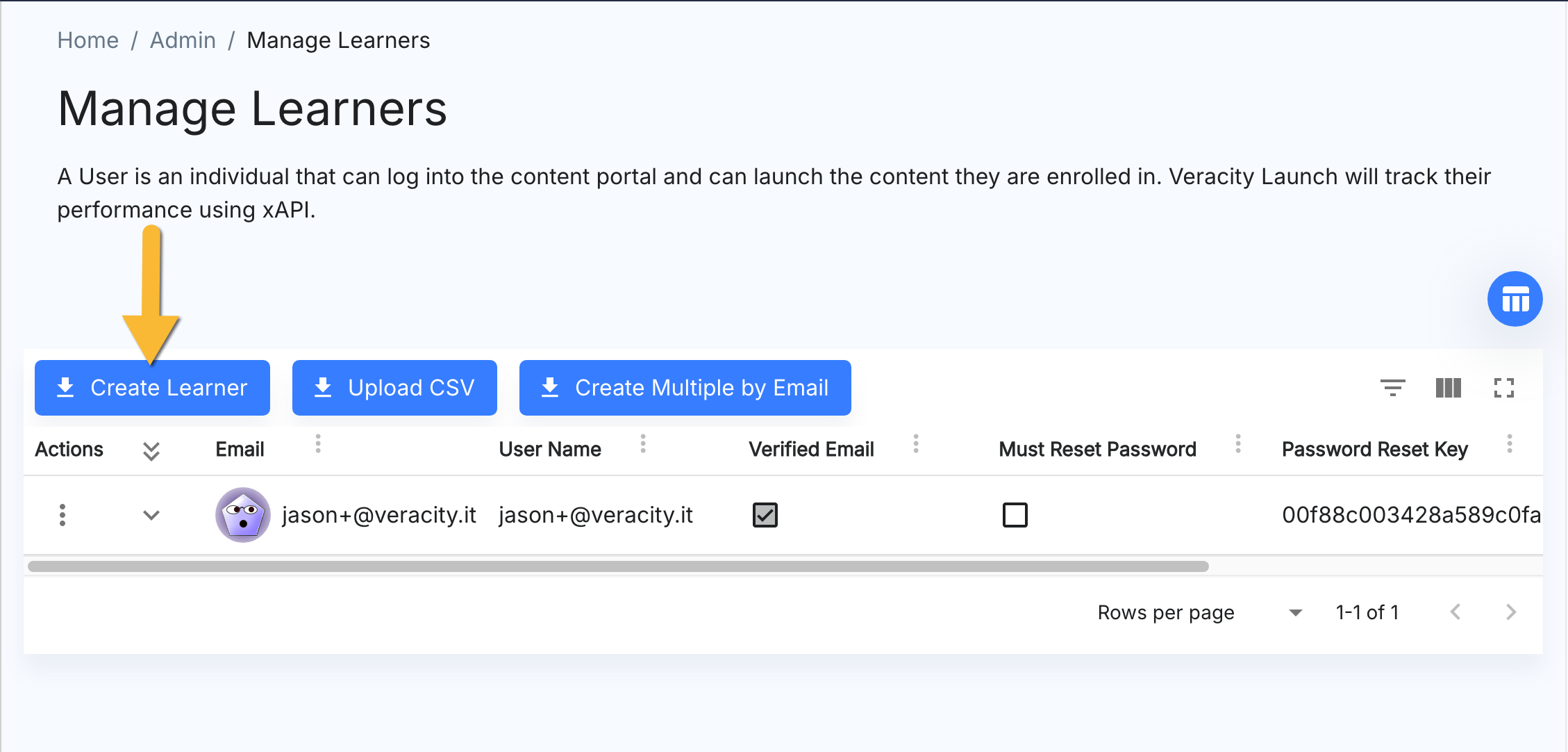 Veracity Launch provides a user interface for the creation and administration of learner accounts in the portal. All learner management functions are accessed from the "Manage Learners" button in the ADMIN menu.